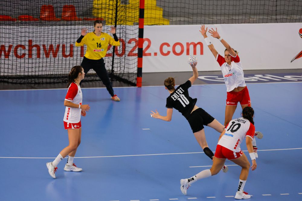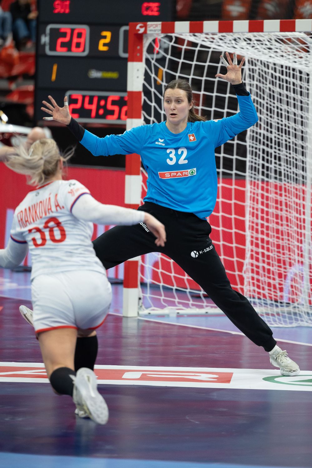 Erster Einsatz für die A-Nati: Claire Hartz im WM-Qualispiel gegen Tschechien am 8. April 2023 in Basel. Die Schweizerinnen scheiterten ganz knapp, durften sich aber über die Rekordkulisse von 3124 Zuschauerinnen und Zuschauern freuen. (Foto: Erich Mosberger)