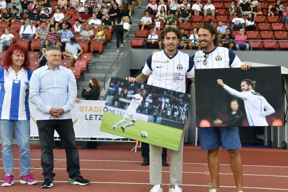 Und tschüss: Marco Schönbächler und Adrian Winter (r.) werden im August 2021 vom FCZ-Präsidiumspaar Canepa verabschiedet (Keystone-SDA).