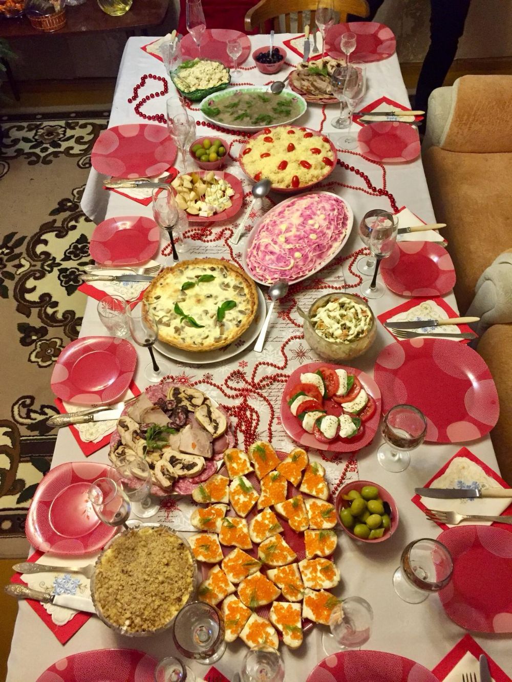 Der Tisch biegt sich unter zahlreichen herrlichen Speisen, darunter Kaviar, verschiedene Salate und, und, und. Während der Mahlzeit steht dann alle 15 Minuten jemand auf und spricht einen Toast aus. Auf das Glück, auf die Liebe, auf weiss ich nicht was. Und jedes Mal wird danach getrunken. Ich bekomme den Eindruck, die Nahrung ist die Begleitung zum Getränk und nicht andersherum.