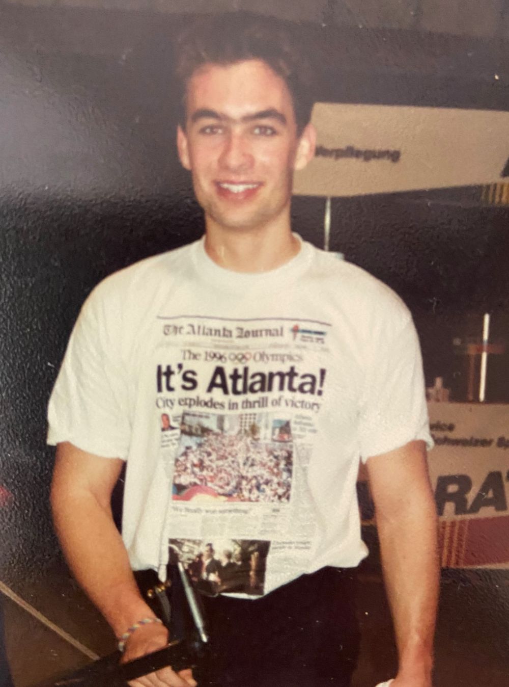 Xeno mit einem T-Shirt, das er im Vorfeld der Spiele von Atlanta erhielt