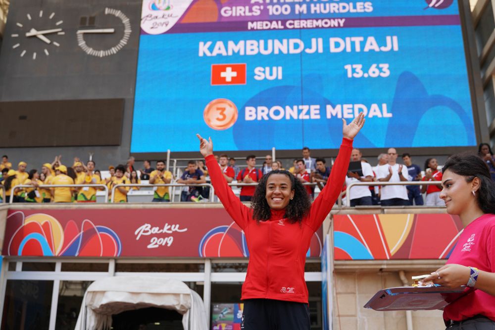 Wettkämpfe in zehn Sportarten, gegen 4‘000 Athletinnen, Athleten und Betreuer aus rund 50 Ländern, über 3‘500 freiwillige Helferinnen und Helfer sowie viel Wind: Nach sieben Wettkampftagen endete in Baku das 15. Olympische Sommerfestival der europäischen Jugend (European Youth Olympic Festival EYOF). Der letzte Wettkampftag hatte es dabei aus Schweizer Sicht in sich: Marithé Engondo aus Lausanne gewann Silber im Hochsprung, während Ditaji Kambundji aus Bern über 100 Meter Hürden und die Schweizer Medley-Staffel jeweils die Bronzemedaille holten. Nicht nur wegen diesen Erfolgen zeigte sich Corinne Staub zufrieden mit dem Abschneiden der Schweizer Talente am EYOF in Baku. «Ich bin überzeugt, unsere jungen Sportlerinnen und Sportler haben wichtige Erfahrungen gesammelt, von denen sie profitieren werden», sagt die Chef de Mission des Swiss Olympic Youth Teams.
